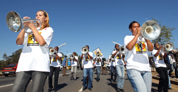 ▲9일 남아공월드컵 리허설에 참여한 자원봉사자들이 개막식이 열릴 요하네스버그 사커시티 경기장으로 행진하고 있다.(사진=연합뉴스)