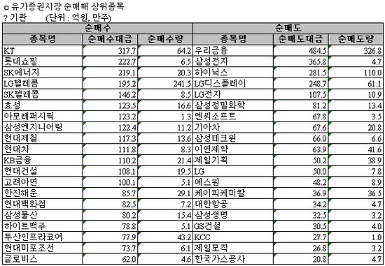 종목별로는 KT(317억원)와 롯데쇼핑(222억원), SK에너지(219억원), LG텔레콤(195억원), SK텔레콤(146억원) 등을 사들였다. 아이폰4 출시로 한 계단 주가 레벨업이 기대되는 KT는 최근 기관투자가의 매수세가 몰리면서 지난 8일 약보합을 제외하고 지난달 31일부터 이날까지 꾸준한 상승세를 보이고 있다.