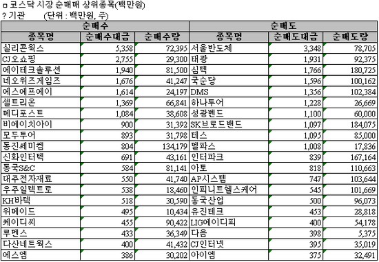 종목별로는 실리콘웍스(53억원)와 CJ오쇼핑(27억원), 에이테크솔루션(19억원), 네오위즈게임즈·에스에프에이(16억원) 등을 순매수했다. 지난 8일 코스닥시장에 신규 상장한 실리콘웍스는 기관이 상장 첫날 일부 순매도를 했지만 이날까지 이틀 연속 사들이면서 사흘째 상승 랠리를 이어가고 있다.