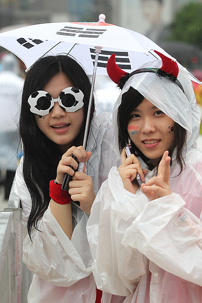 2010 남아공 월드컵 대한민국-그리스 경기가 시작되기전 12일 서울광장에 모인 여학생들이 재미있는 응원복장을 하고 있다.