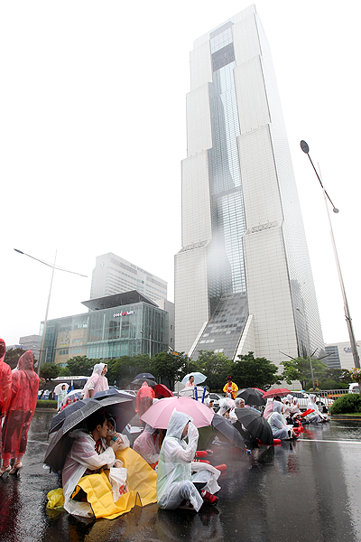 대한민국과 그리스의 첫 경기가 열리는 12일 오후 서울 삼성동을 찾은 시민들이 비가오는 날씨에도 불구하고 코엑스 앞에 자리를 차지하고 있다.