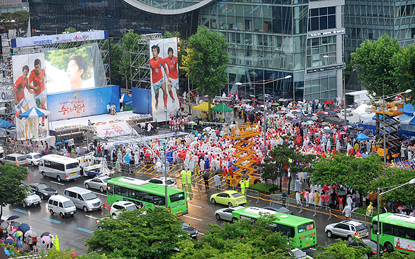 12일 2010남아프리카 월드컵 예선 한국과 그리스의 경기를 앞두고 거리응원을 위해 응원을 위해 나온 시민들이 삼성동 거리를 메우고 있다.