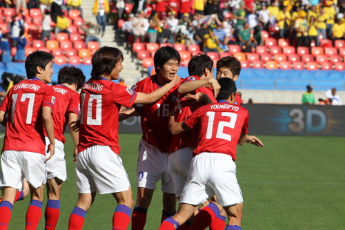 ▲12일 밤(한국시간) 포트엘리자베스 넬슨 만델라 베이 스타디움에서 열린 남아공월드컵 B조 첫경기 한국-그리스 경기에서 한국 선수들이 첫 골을 넣고 나서 환호하고 있다.(사진=연합뉴스)