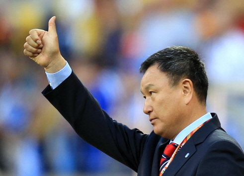 허정무 축구대표팀 감독이 12일 오후(한국시간) 남아프리카공화국 포트엘리자베스 넬슨 만델라 베이 스타디움에서 열린 월드컵 B조 예선 첫 경기 한국과 그리스 경기에서 골이 터지자 엄지 손가락을 치켜세우고 있다. 이날 한국은 2-0으로 승리했다.