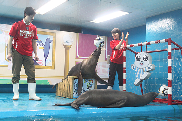 여의도 63씨월드에서 15일 오전 2010 남아공 월드컵 대한민국-아르헨티나 경기를 앞두고 한국팀의 선전을 기원하며 물개들과 조련사들이 함께 응원하고 있다.