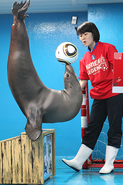 여의도 63씨월드에서 15일 오전 2010 남아공 월드컵 대한민국-아르헨티나 경기를 앞두고 한국팀의 선전을 기원하며 물개들과 조련사들이 함께 응원하고 있다.