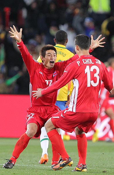 16일(한국시간) 남아프리카공화국 요하네스버그 엘리스파크 스타디움에서 열린 북한과 브라질 월드컵 조별1차전에서 북한 안영학이 지윤남의 골 성공 뒤 박철진과 함께 기뻐하고 있다.