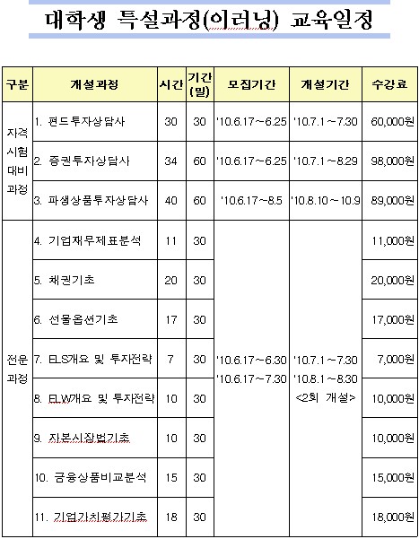 대학생 특설과정은 주식, 채권, 파생상품, IB 등 전문과정과 자격시험 대비과정으로 금융분야의 기초 실무지식을 습득할 수 있도록 다양하게 구성됐다.