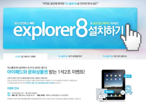 NHN은 마이크로소프트와 함께 익스플로러6 사용자들을 대상으로 보다 안전하고 빠른 브라우저인 익스플로러8로 업그레이드를 유도하는 캠페인을 진행하기로 했다고 밝혔다. 이용자는 캠페인 페이지의 ‘익스플로러8 설치하기’버튼을 클릭하는 것만으로도 쉽게 브라우저를 업그레이드 할 수 있다.