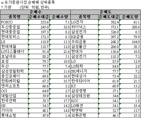 반면 기관은 LG전자(582억원), 하이닉스(572억원), 삼성전자(526억원), KB금융(397억원), 우리금융(248억원) 등을 팔았다. 기관은 유가증권시장의 대표적 IT관련주인 LG전자와 하이닉스, 삼성전자를 대거 팔았으며 특히 LG전자를 지난달 12일부터 28거래일 연속 순매도 중이다.