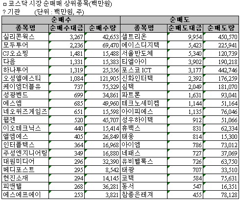 종목별로는 실리콘웍스(32억원)와 모두투어(22억원), CJ오쇼핑(14억원), 다음·하나투어(13억원), 오성엘에스티(10억원) 등을 순매수했다. 기관은 실리콘웍스가 지난 8일 상장한 이후 단 두차례의 순매도에 그칠 정도로 연속 순매수에 나서고 있다.