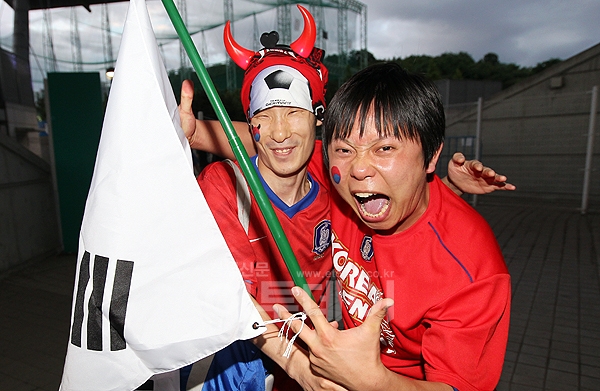 대한민국과 우루과이와의 16강 경기가 열릴 예정인 26일 저녁 경기시간 3시간여를 앞두고 수원월드컵경기장에 응원을 위해 나온 시민들이 대한민국 화이팅을 외치고 있다.