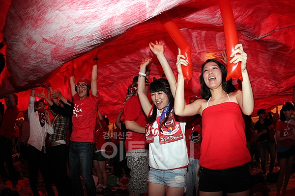 2010 남아공 월드컵 16강전 대한민국-우루과이 경기를 앞둔 26일 저녁 서울광장에 거리응원을 나온 시민들이 대형 태극기를 옮기는 리허설을 하고 있다.