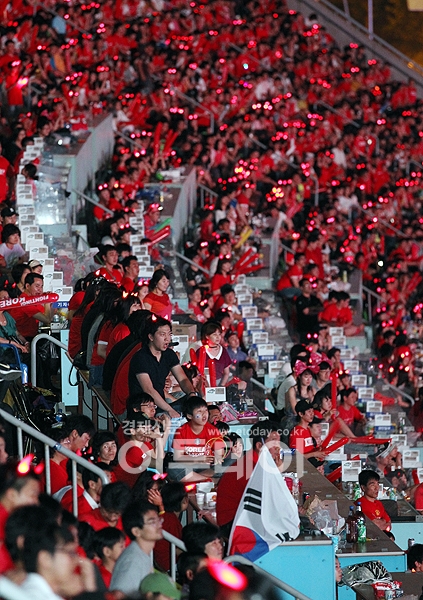 26일 저녁 대한민국과 우루과이의 16강전이 펼쳐지고 있는 가운데 수원월드컵경기장은 붉은 물결로 가득차 있다.