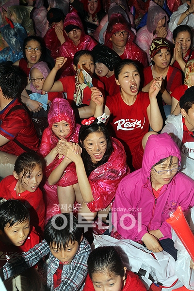2010 남아공 월드컵 16강전 대한민국-우루과이 경기가 진행중인 26일 밤 0:1 상황에서 대표팀이 기회를 놓치자 서울광장의 시민들이 안타까워 하고 있다.
