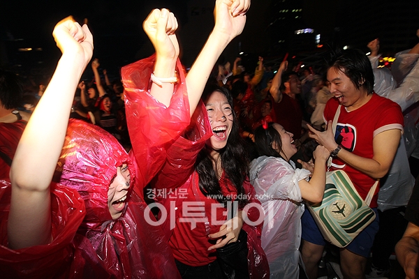 2010 남아공 월드컵 16강전 대한민국-우루과이 경기가 진행중인 27일 후반 이청용 선수가 만회골을 넣자 서울광장에서 거리응원을 하던 시민들이 환호하고 있다.