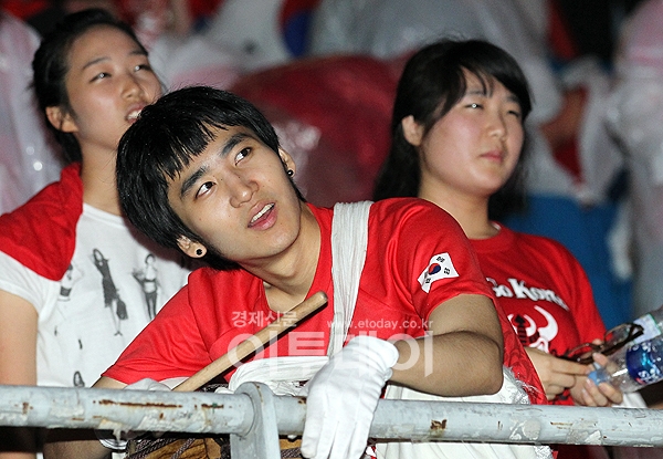 남아공월드컵 16강 진출을 놓고 싸웠던 대한민국과 우루과이간의 경기가 우루과이가 2:1로 승리로 끝이 나자 수원월드컵경기장의 붉은악마 응원단이 허탈한 표정을 짓고 있다.