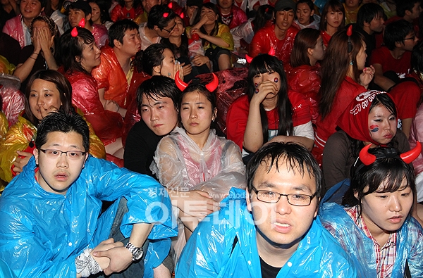 2010 남아공 월드컵 16강전 대한민국-우루과이 경기가 진행중인 27일 후반 우루과이에 추가골을 허용하자 서울광장에서 거리응원을 하던 시민들이 안타까워하고 있다.