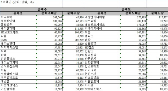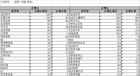 업종별로는 제조업과 전기전자와를 집중 매도한 가운데 운수장비, 서비스업, 화학 등에서도 매물을 출회했다. 반면 유통업, 보험업 등은 사들였다.