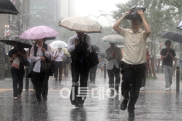 전국적으로 장맛비가 내리는 가운데 2일 아침 여의도 회사원들이 갑자기 내린 빗속에서 출근길을 서두르고 있다.