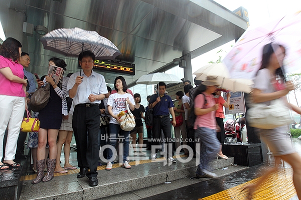 전국적으로 장맛비가 내리는 가운데 2일 아침 여의도 회사원들이 갑자기 내린 빗속에서 출근길을 서두르고 있다.