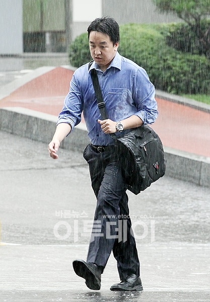 장맛비가 내리고 있는 2일 오전 서울 남대문로의 한 직장인이 우산을 미리 준비하지 못해 온몸이 흠뻑젖은 채 출근길을 재촉하고 있다.