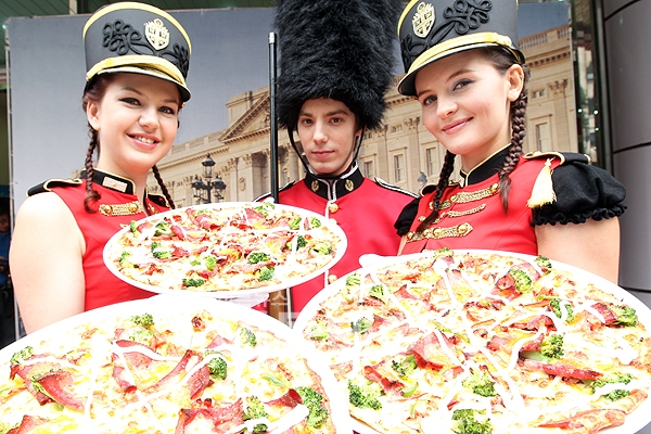 8일 오전 도미노피자 여의도점에서 영국식 요리피자 '로스트비프' 피자 출시를 기념해 영국 근위병 복장을 한 모델들이 제품을 선보이고 있다.