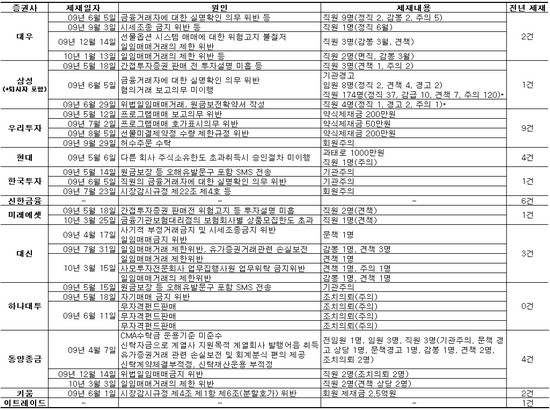 국내 주요 증권사 10개사와 개인투자자들이 많이 이용하는 온라인 특화 증권사 2개사의 2009 회계연도(2009년 4월~2010년 3월) 사업보고서에 기재된 제재조치를 분석한 결과 대우와 삼성증권, 한국투자증권, 대신증권, 하나대투증권 등 대형사의 제재조치가 전년대비 증가했다.