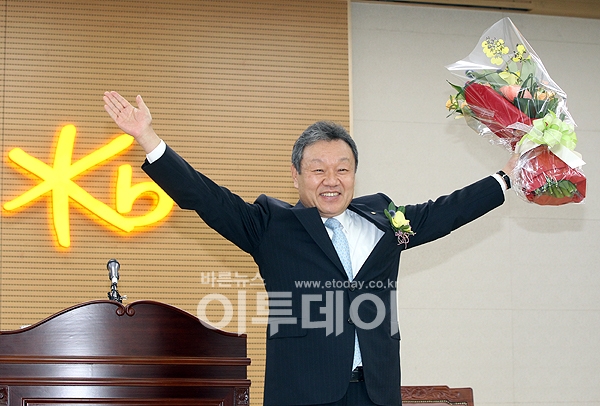13일 여의도 국민은행 본점에서 열린 임시주주총회에서 KB금융지주회장으로 선임된 어윤대 회장이 취임식에 참석해 꽃다발을 들고 기뻐하고 있다.