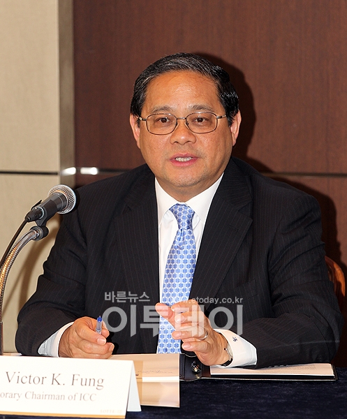 빅터 풍 국제상업회의소 회장이 13일 오후 소공동 롯데호텔에서 열린 기자감담회에 참석해 인사말을 하고 있다.