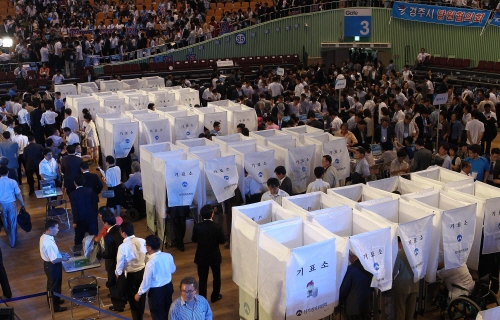 14일 오후 서을 잠실실내체육관에서 열린 한나라당 제11차 전당대회에서 당원들이 투표를 하고 있다.