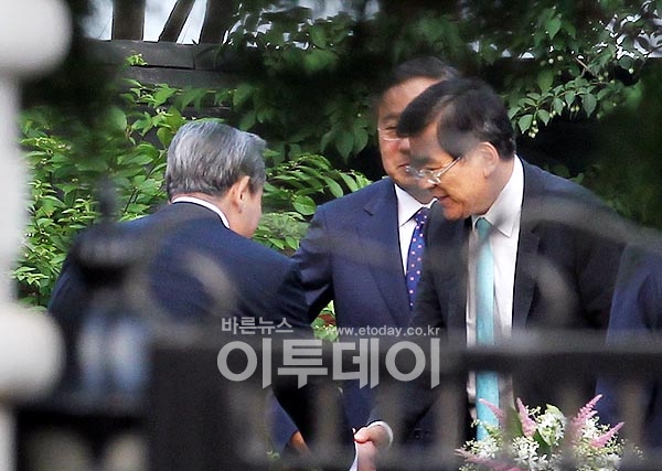 15일 오후 서울 용산구 한남동 삼성그룹 영빈관인 승지원에서 이건희 회장초청으로 전국경제인연합회 회장단 만찬회동이 이뤄진 가운데 조양호 한진그룹 회장이 이건희 회장과 인사를 나누고 있다.