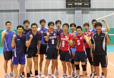 신치용(맨 오른쪽) 감독이 지휘하는 남자 배구대표팀이 용인 삼성트레이닝센터에 모여 본격적인 훈련에 들어갔다. 이날 선수들이 훈련 후 올 11월 광저우 아시안게임에서 3회 연속 우승을 목표로 파이팅을 외치고 있다.