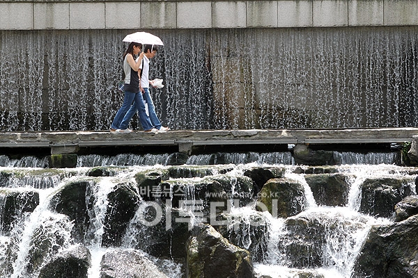 전국적으로 찜통 더위가 기승을 부리고 있는 20일 오후 청계천을 찾은 커플이 데이트를 즐기고 있다.