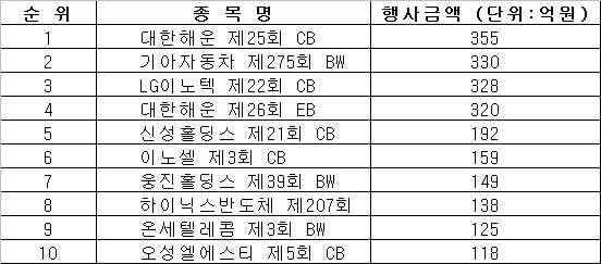 상반기 주식관련사채 권리행사 청구금액 상위 종목은 대한해운 제25회 전환사채, 기아자동차 제275회 신주인수권부사채, LG이노텍 제22회 전환사채, 대한해운 제26회 교환사채, 신성홀딩스 제21회 전환사채 등 순으로 집계됐다.