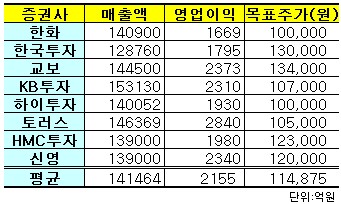 증권사별로는 한화증권이 1669억원을 제시하면서 영업이익 추정치가 가장 낮았고 토러스투자증권이 2840억원을 8개 증권사 중 추정치가 가장 높았다. 또한 한국투자증권과 하이투자증권, HMC투자증권도 추정한 영업이익 추정치도 2000억원이 채 되지 않았다.