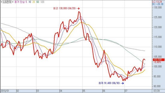 LG전자는 2분기 실적 부진 전망에 따른 조정 이후 28일 실적 발표를 앞두고 가격 메리트 부각과 하반기 개선에 대한 기대감에 최근 3거래일 연속 상승하면서 간신히 10만원대 주가를 회복한 상황이다.