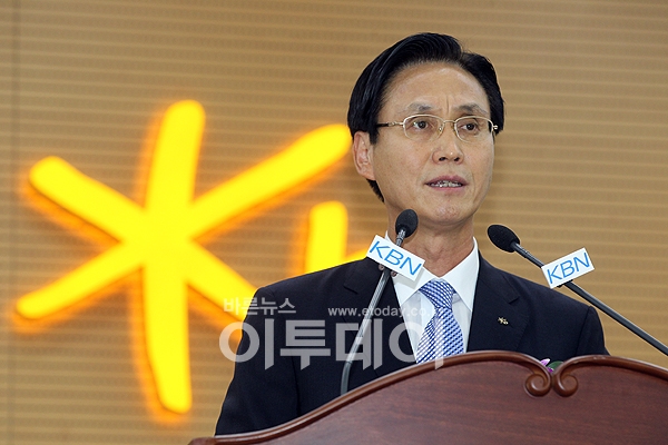 민병덕 국민은행장이 29일 여의도 국민은행 본점 강당에서 열린 취임식에서 취임사를 하고 있다.