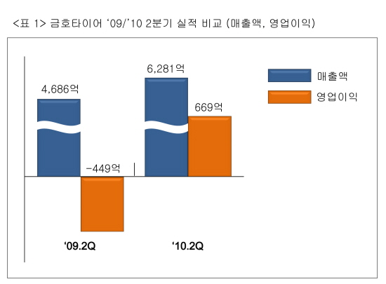 금호타이어는 30일 공시한 2010년도 2분기 실적 발표에서 2분기 매출액은 전년 동기 대비 34%, 전 분기 대비 7.1% 증가한 6281억원을 기록했다고 밝혔다. 영업이익은 전 분기 대비 214% 증가한 669억원, 영업이익률은 10.7%, 당기순이익은 539억을 각각 기록했다.