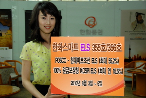 ‘한화스마트ELS 355호’는 포스코와 현대미포조선을 기초자산으로 하는 스텝다운 (StepDown) ELS(3일 평균형)로 3년 만기로 운용된다. 매 6개월마다 조기상환조건이 충족되면 최대 연 18.4%의 수익이 지급되는 상품이다. 상환구조는 조기상환평가일에 기초자산의 종가가 최초기준가격의 90%(6, 12개월), 85%(18, 24개월), 80%(30,36개월) 이상인 경우 최대 연 18.4%의 수익률로 조기상환된다. 만기까지 상환조건을 충족하지 못할 경우에도 기초자산 가격이 55% 미만으로 하락한 적이 없으면 원금과 연 18.4%의 수익을 지급한다. 또한 ELS 제도개선안을 반영해 조기상환평가일과 만기상환평가일을 3일 종가 산술평균을 적용하도록 해 투자자 보호장치를 강화했다.