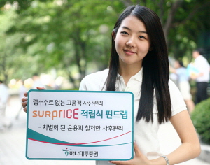 하나대투증권 랩운용부 박민수 상무는 “써프라이스 적립식 펀드랩은 추가 수수료 없이 적은 금액으로 차별화된 운용과 주기적인 자산비율조정과 다양한 사후관리 시스템으로 한 발 앞선 수익률을 기대할 수 있다”고 밝혔다.
