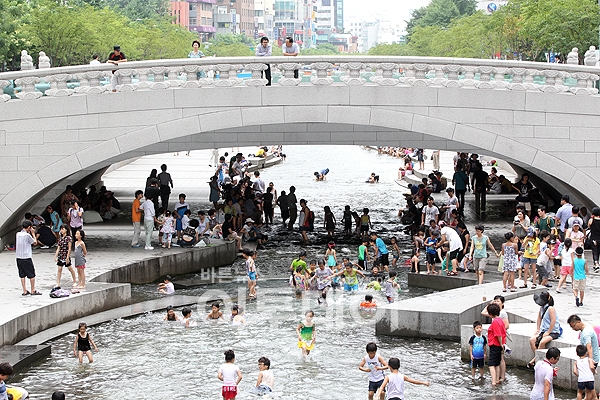 전국적으로 30도를 웃도는 찜통더위가 계속되고 있는 5일 오후 더위를 참지 못한 어린이들이 청계천으로 들어가 물놀이를 즐기고 있다.