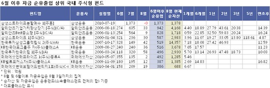 펀드평가사 제로인에 따르면 6월 이후 8월3일 현재까지 순자산이 가장 많이 늘어난 펀드는 삼성자산운용의 '삼성스트라이크분할매수 1[주혼]'이다. 지난 7월19일 설정된 이 펀드는 7월 한달간 1373억원의 자금이 유입됐다.