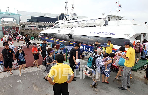 휴가 절정인 6일 오전 인천연안여객터미널을 찾은 피서객들이 덕적도로 향하는 배에 오르고 있다.