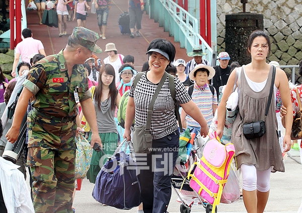 휴가 막마지인 6일 오전 인천연안여객터미널을 통해 인천근해의 섬으로 휴가를 떠나려는 여행객과 한 해병대 관계자가 즐겁게 대화를 나누고 있다.