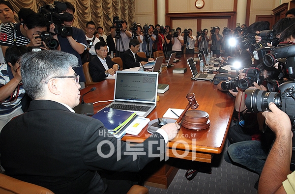 김중수 한국은행 총재가 12일 오전 소공동 한국은행 본관에서 열린 금융통화위원회에서 회의 시작을 알리는 의사봉을 두드리고 있다.