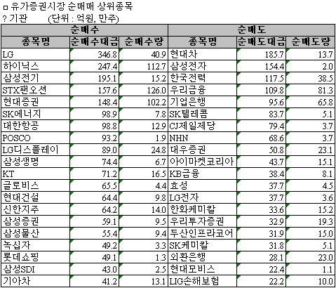 종목별로는 LG(346억원)와 하이닉스(247억원), 삼성전기(195억원), STX팬오션(157억원), 현대증권(148억원) 등을 순매수했다. 기관은 비상장 자회사에 대한 재평가를 호재로 LG를 지난 7월12일부터 26거래일 연속 사들이고 있으며 이를 바탕으로 LG의 주가는 6만6000원대에서 8만4000원대까지 올랐다.