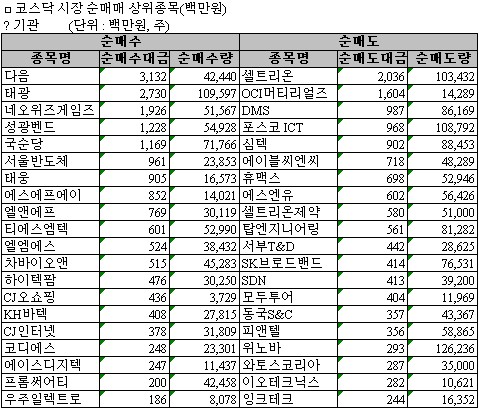 종목별로는 다음(31억원)과 태광(27억원), 네오위즈게임즈(19억원), 성광벤드(12억원), 국순당(11억원) 등을 사들였다. 기관은 해외 자회사의 매각으로 국내 사업에 역량을 집중한다고 전한 다음을 나흘째 순매수 중이며 이에 주가도 사흘 연속 올랐다.