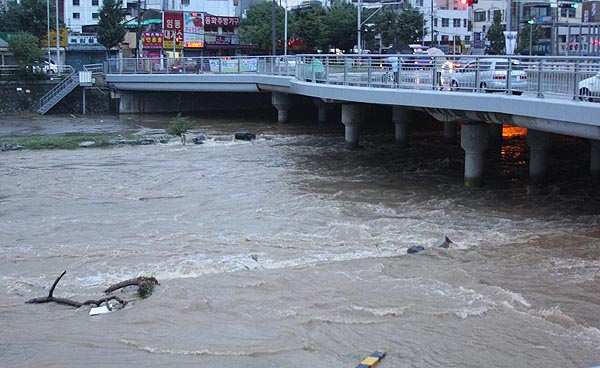 지난 16일 밤부터 17일 새벽까지 광주·전남 일부 지역에 폭우가 쏟아져 주택과 도로, 농경지가 침수되는 등 피해가 잇따랐다. 전날 밤부터 이날 오전 6시까지 담양에 154㎜, 광주 98.5㎜ 등의 비가 내렸다. 사진은 불어난 광주 서구 양동교 아래 광주천으로 천변 주차장이 물에 잠겨 보이지 않고 있는 상황.