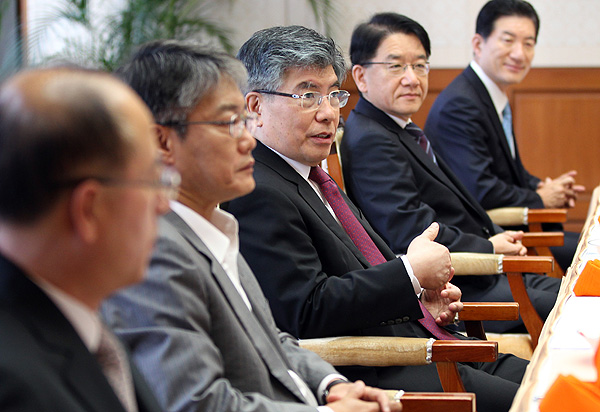 18일 서울 소공동 한국은행에서 열린 경제동향 간담회에서 김중수 한은총재(가운데)가 인사말하고 있다.